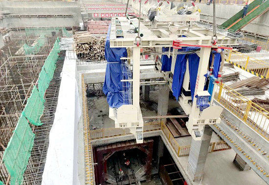 為保證設(shè)備有序進場組裝,項目部積極組織加快九水東路站主體結(jié)構(gòu)施工,在TBM進場前將前五段中板施工完成,保證前期組裝工作不受車站主體結(jié)構(gòu)施工影響。與此同時,TBM始發(fā)基座、反力架已經(jīng)提前下井,另對軌行區(qū)提前進行清理,并鋪設(shè)軌道,讓電瓶車提前下井,保證臺車下井后,能立即放至指定區(qū)域組裝。此外,憑借6#TBM吊裝始發(fā)的經(jīng)驗,在5#TBM進場前,項目部迅速將施工現(xiàn)場吊裝區(qū)清理出來,保證設(shè)備進場不受場地問題制約。