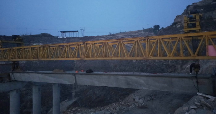 圖為首片箱梁架設(shè) 當(dāng)天架梁施工開始時(shí),40米長(zhǎng)、重一百多噸的箱梁,經(jīng)過(guò)1個(gè)多小時(shí)的運(yùn)輸,第一片箱梁順利抵達(dá)寨峁大橋橋頭。早已等候在現(xiàn)場(chǎng)的架梁工人在架梁總指揮的統(tǒng)一指揮下,提梁、移梁、落梁等系列架梁工作隨即有序展開,在經(jīng)歷了3個(gè)多小時(shí)緊張有序工作后,第一片箱梁安全平穩(wěn)架設(shè)成功。