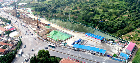 九水東路站主體基坑全長225米,標準段寬19.7米,基坑深約19-20米,為地下兩層島式車站。車站場地經(jīng)削山處理,基坑主要處于中風化、微風化凝灰?guī)r地層,巖層硬度較大,基坑總出渣量預計達10萬方。