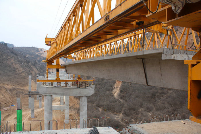 南溝5#大橋兩邊是山,大橋沿山溝布設(shè)。冬天溝內(nèi)就是一個(gè)風(fēng)口,施工人員冒著呼嘯的寒風(fēng)在大橋上進(jìn)行架梁作業(yè),他們熟練地操作著架橋機(jī),半個(gè)小時(shí)不到,安全、精準(zhǔn)的將一片長30米、重達(dá)96噸的預(yù)應(yīng)力混凝土箱梁穩(wěn)穩(wěn)架設(shè)在大橋墩身上。據(jù)了解,該橋全長646.5m,一共需要鋪設(shè)30米預(yù)應(yīng)力箱梁96片。