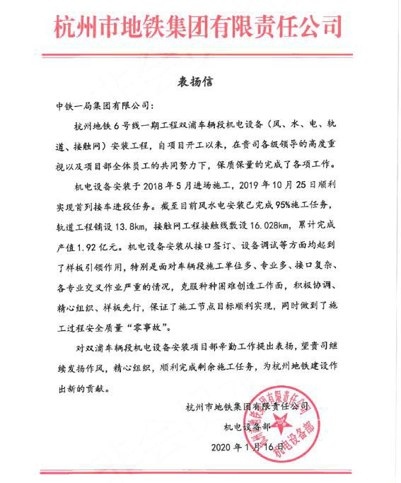 (杭州訊)1月16日,杭州地鐵集團公司機電設(shè)備部向中鐵一局建安公司杭州地鐵6號線雙浦機電項目發(fā)來表揚信,對項目部克服種種困難,保質(zhì)保量完成施工任務(wù)所付出的辛勞提出表揚,并希望項目部繼續(xù)發(fā)揚良好的作風順利完成剩余施工任務(wù)。