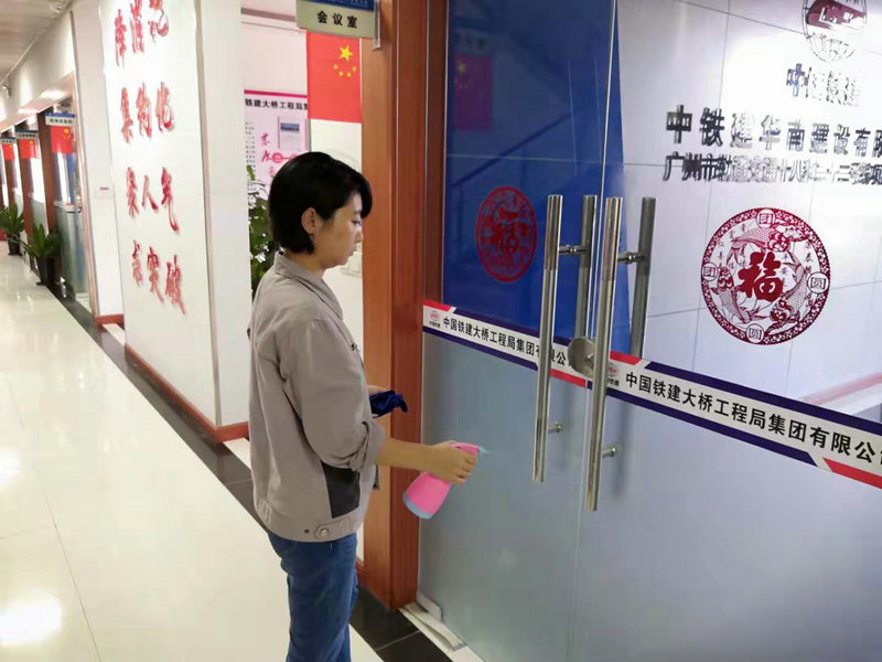 一分部(中鐵十九局管段)值班人員對(duì)項(xiàng)目食堂、辦公區(qū)、廁所等公共點(diǎn)進(jìn)行了全面消毒殺菌。