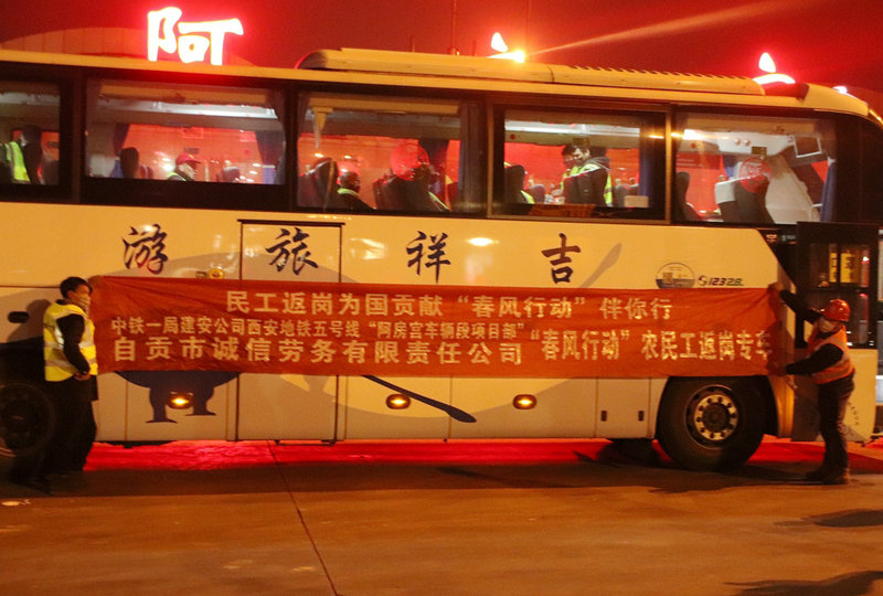 2月23日晚上11點(diǎn),西安地鐵五號(hào)線阿房宮車輛段項(xiàng)目部安排的大巴車,將四川富順的40名農(nóng)民工接回本項(xiàng)目部返崗。這次迎接農(nóng)民工歷時(shí)11個(gè)小時(shí),返程來回1667公里。本次得已順利接到農(nóng)民工兄弟們,正是響應(yīng)國(guó)家的"春風(fēng)行動(dòng)",本單位積極與四川省政府相關(guān)部門溝通協(xié)商,取得政府支持,建立綠色通道,幫助農(nóng)民工盡快返崗實(shí)現(xiàn)就業(yè)。