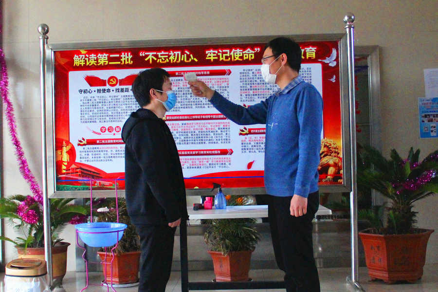 圖2:“戰(zhàn)役”小分隊的張陽(右)正為項(xiàng)目職工測量體溫
