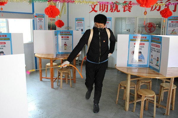 圖2:項目辦公室副主任駱文濤對食堂進行消毒