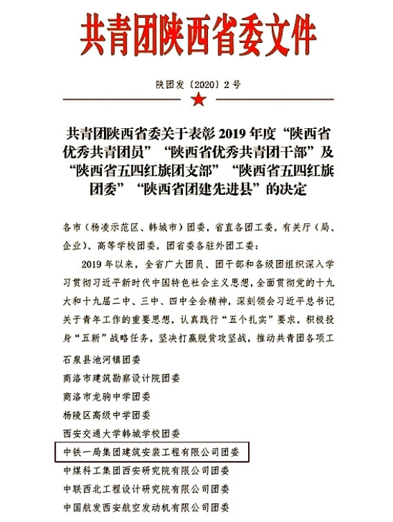 近日,共青團(tuán)陜西省委下發(fā)通知對(duì)2019年度51個(gè)基層團(tuán)委進(jìn)行了表彰,中鐵一局建安公司團(tuán)委被授予“陜西省五四紅旗團(tuán)委”稱號(hào),這是中鐵一局建安公司首次獲得該項(xiàng)榮譽(yù)。
