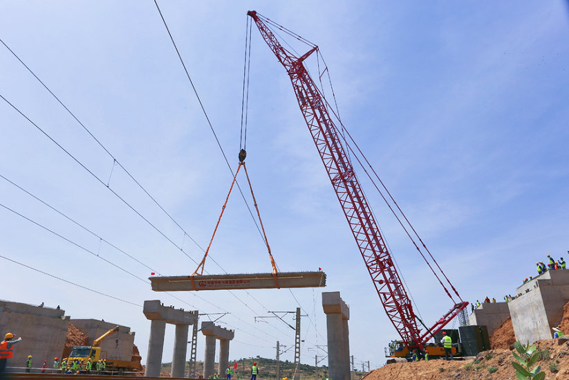 此次架梁施工的K4跨鐵路橋跨越采用中國標準和中國裝備建設而成的東非第一條電氣化鐵路——亞吉鐵路,分為左右兩幅,共計24片梁。亞吉鐵路是一條以貨運為主的客貨共線鐵路,已于2016年開通運營。“鐵路上空回流線、接觸網(wǎng)錯綜復雜,危險系數(shù)高,施工難度大。為確保此次架梁安全,我們提前與負責該鐵路運營的部門聯(lián)系,對線路進行錯峰斷電架梁施工。”在架梁現(xiàn)場,項目經(jīng)理檀廷夫介紹道。