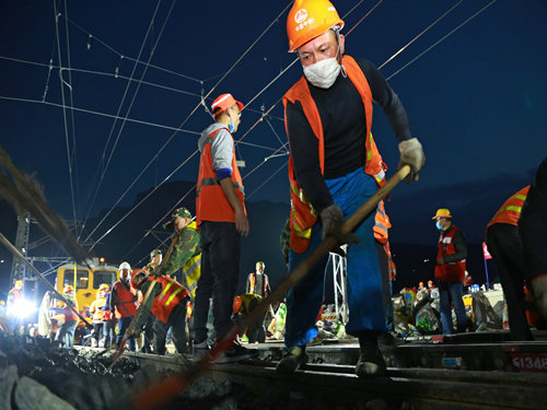 10分鐘后,300余名工人們各自進(jìn)入預(yù)定施工地段展開(kāi)作業(yè)。鋸軌、扒砟、軌道撥接......工人們個(gè)個(gè)疾步前行。