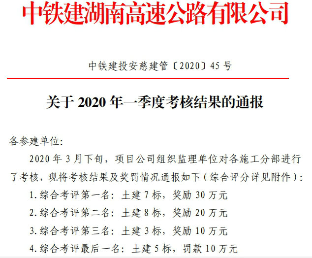 近期,中鐵建湖南高速公路有限公司(業(yè)主單位)開(kāi)展了2020年一季度綜合考核,中鐵二十三局四公司安慈項(xiàng)目土建7標(biāo)在全線9個(gè)參建單位中脫穎而出,榮獲第一名。這也是該項(xiàng)目繼2019年三、四季度信用評(píng)價(jià)第一名、“大干60天”勞動(dòng)競(jìng)賽第一名及2019年度信用評(píng)價(jià)考核第一名(綜合得分:96.28,項(xiàng)目?jī)?nèi)評(píng)價(jià)級(jí)別:AA)后再次蟬聯(lián)第一名,喜獲獎(jiǎng)勵(lì)30萬(wàn)元。