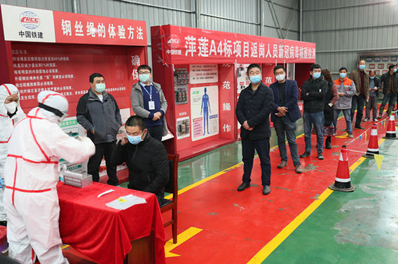 萍蓮A4標項目是湖北企業(yè),大多數(shù)參建人員都來自湖北,目前近半數(shù)湖北籍參建人員已通過“贛通碼”,順利返回工地。為了消除參建人員恐慌心理,確保百分百安全生產(chǎn),項目部專職副書記劉濤多次與萍鄉(xiāng)市湘東區(qū)衛(wèi)健委溝通協(xié)調(diào),請來了衛(wèi)健委的專業(yè)檢測團隊,為湖北返崗人員做核酸檢測。當日做的核酸檢測,次日就可以出結(jié)果。