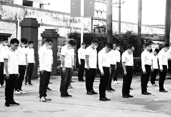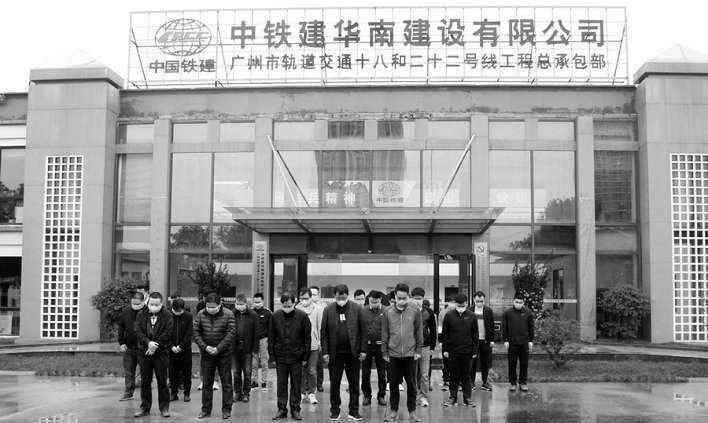 當(dāng)上午10點(diǎn)到達(dá)的那一刻,在中鐵建華南建設(shè)18/22號(hào)線總承包部大院里,汽車笛聲驟然響起,公司副總經(jīng)理、總工程師兼十八和二十二號(hào)線黨工委書記、常務(wù)副總經(jīng)理徐加兵與大家一道,迎著微風(fēng)小雨,整齊地站在大門前,面對(duì)莊嚴(yán)的國(guó)旗,低頭默哀,緬懷防疫抗疫的英雄。正在全線進(jìn)行周六例行安全檢查的9個(gè)小組,全部停止檢查,在所在工地就地肅穆默哀,參加所在工點(diǎn)的哀悼活動(dòng)。