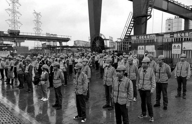 高大的龍門吊下,三分部(中鐵二十二局管段)的工人們整齊地排列在一起,滿含悲痛,靜靜地佇立在半旗下面,以國(guó)旗是瞻,緬懷防疫抗疫英雄和逝去的通報(bào)英烈,化悲痛為力量,決心更好地投入到施工生產(chǎn)之中。
