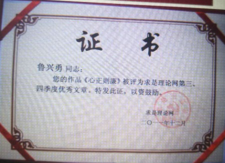 參加工作30多年,得到的各類證書(shū)和各種獎(jiǎng)品也不少,但都沒(méi)有這一次讓我感到激動(dòng)和覺(jué)得珍貴。我還真是第一次接受寄來(lái)的證書(shū)和獎(jiǎng)品,更是頭一回榮獲印有“中共中央機(jī)關(guān)刊《求是》雜志理論網(wǎng)”字樣的證書(shū),能不高興嗎?!從前發(fā)證書(shū)和獎(jiǎng)品都是在隆重的大會(huì)上,由領(lǐng)導(dǎo)親自頒發(fā)到手的,開(kāi)幾天會(huì)發(fā)個(gè)證的模式成了固有流程,開(kāi)會(huì)必發(fā)證,發(fā)證必開(kāi)會(huì)成了習(xí)慣。從發(fā)證書(shū)的方式也可以折射出一個(gè)時(shí)代的進(jìn)步和工作作風(fēng)的轉(zhuǎn)變。