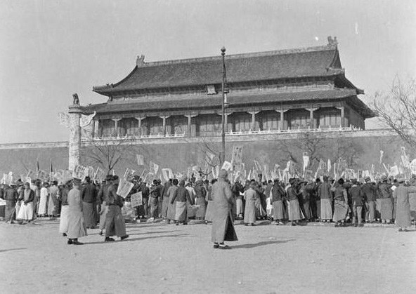 圖為北京民眾及大學(xué)生聚集在天安門廣場(chǎng)前的照片